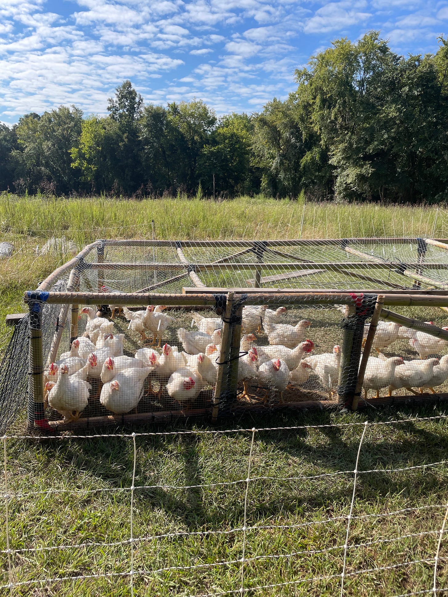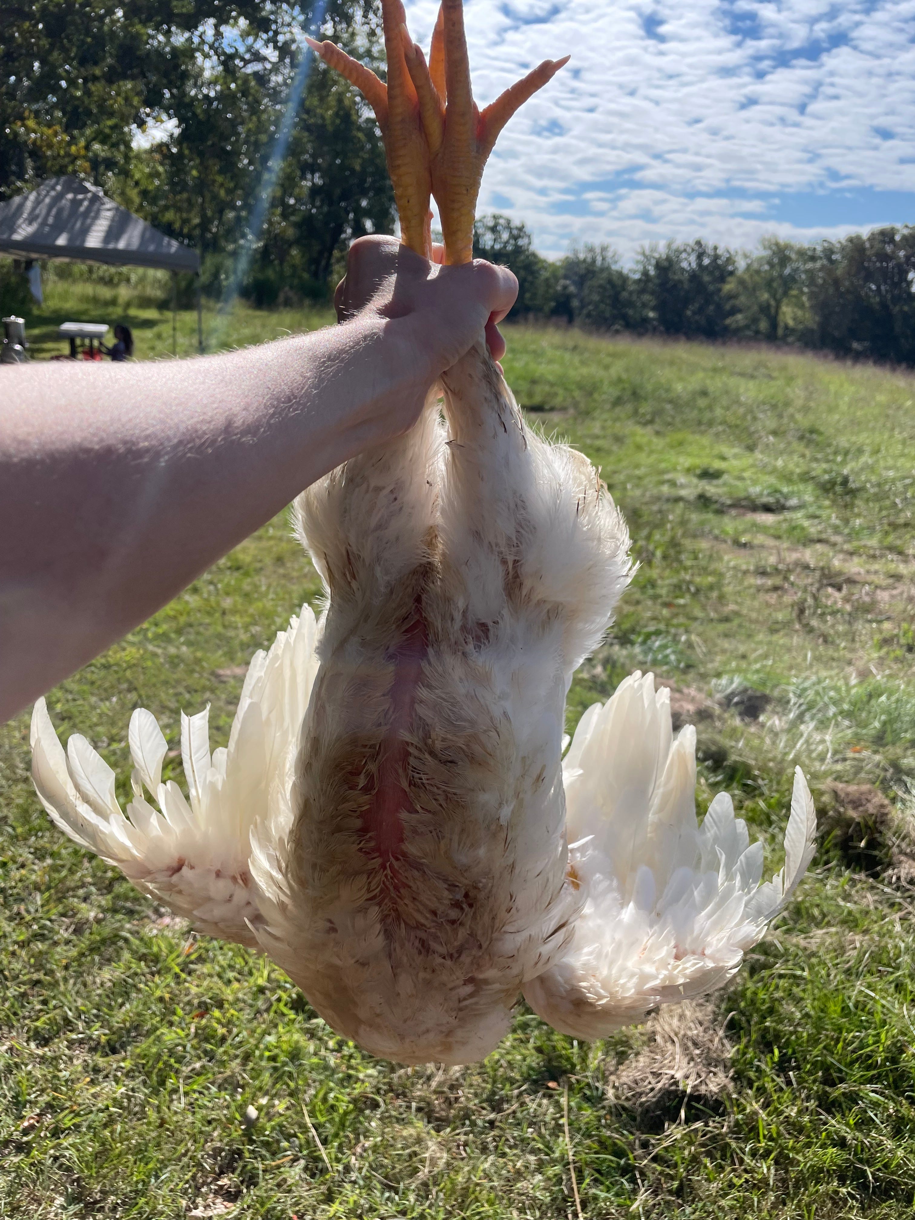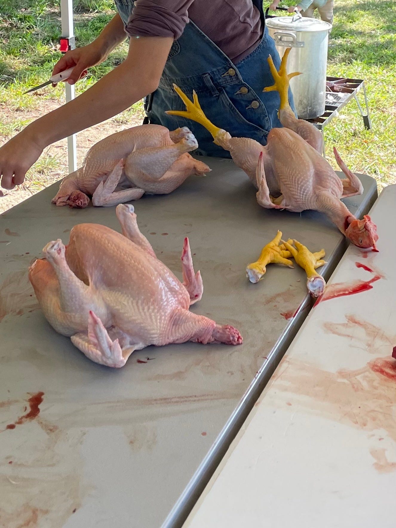 I am not squeamish but still worried about how my body would react to the process, to the feel of flesh splitting beneath the knife in my own hand, to see the fresh blood dripping down the tree into the earth. In the moment it felt fine, natural even, as the seven or so people gathered began to find a rhythm together: plucking birds from the tractor, sliding them head first into the cones, boiling them before dropping them into the washing-machine-looking drum that removed the feathers (apparently it takes a good 20 minutes to de-feather one bird by hand, they purchased one of these machines immediately after processing their first batch without one), then bringing them to the sanitized tables for the final steps (removing the innards, cutting off the feet and heads). After trying out each job, I found that I enjoyed the parts that involved the feathered bird more than the raw, naked ones, something about handling and then taking the life felt simpler than butchering what was left after we defiled its body. However, after a couple of hours and after taking the life of dozens of birds, I began to feel something rising within me, emotions that I didn’t have names for. I cleaning myself up, collected my daughter and our things, and drove home in an eerie and emotionally charged silence.